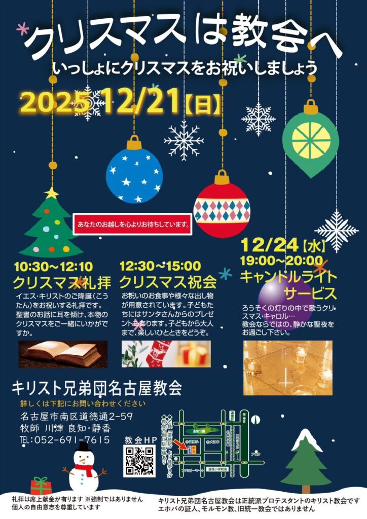 名古屋教会では各集会をご用意しています。どの集会もとてもあたたかな雰囲気ですので、教会が初めてという方でも、どなたでもお気軽にご参加いただけます。あなたのお越しを心よりお待ちしております。