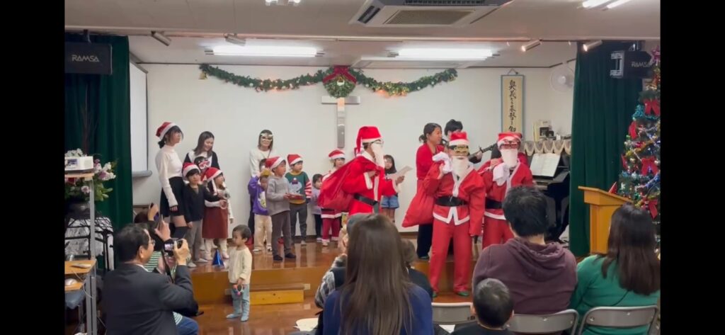 ハンドベル演奏やクイズ、スキット、子どもたちの元気な歌など様々な出し物で楽しんだ後はサンタさんの登場です🤩みんなプレゼントもらえてよかったね🎶